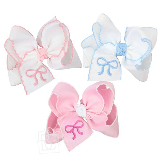 Beyond Creations, LLC - EMBROIDERED BOW CROCHET EDGE HAIR BOW ON ALLIGATOR CLIP : White w/ Light Pink Crochet Edge & Light Pink Embroidered Bow / 5.5" Huge