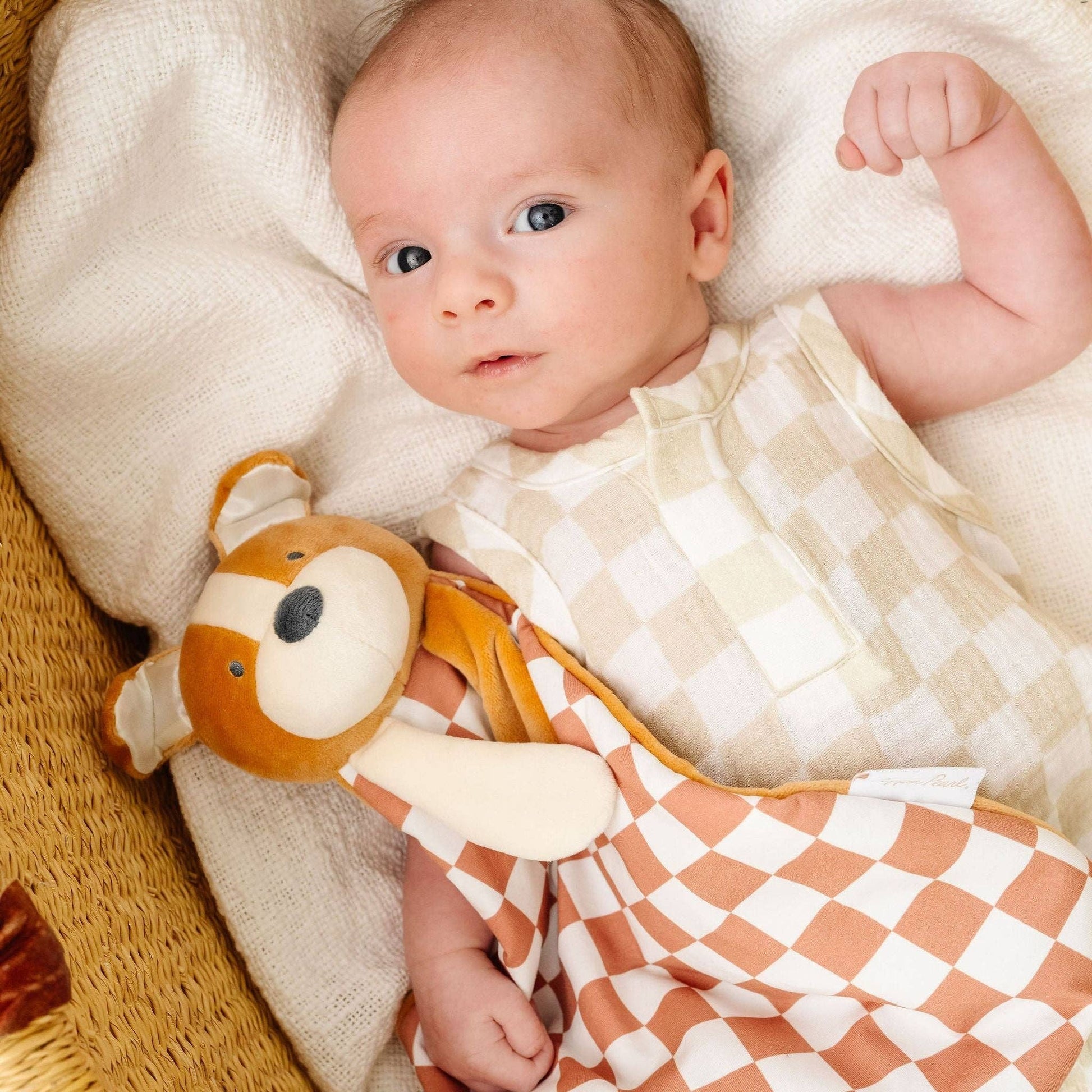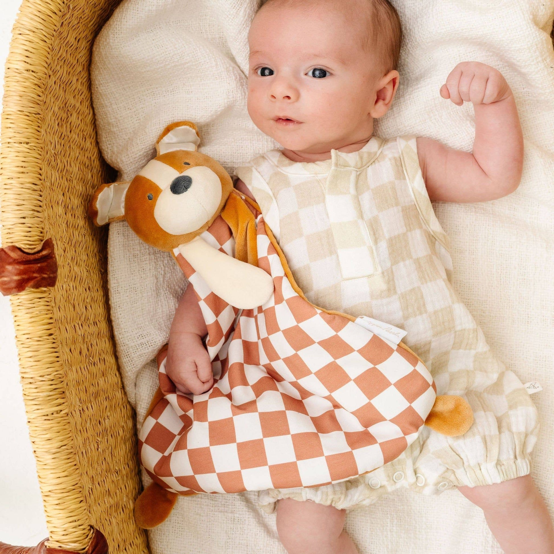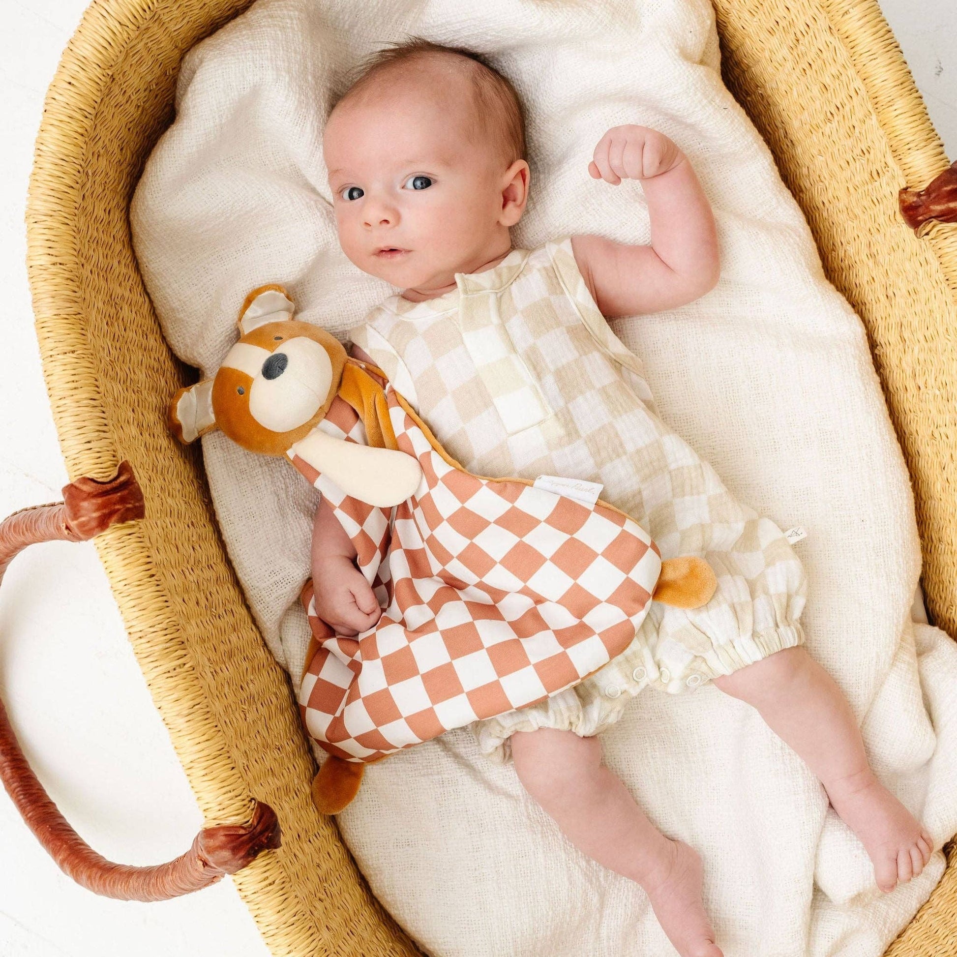 Just the right size to take on the go, this snuggly lovey features a squishy head, and a super-soft fabric to comfort baby.